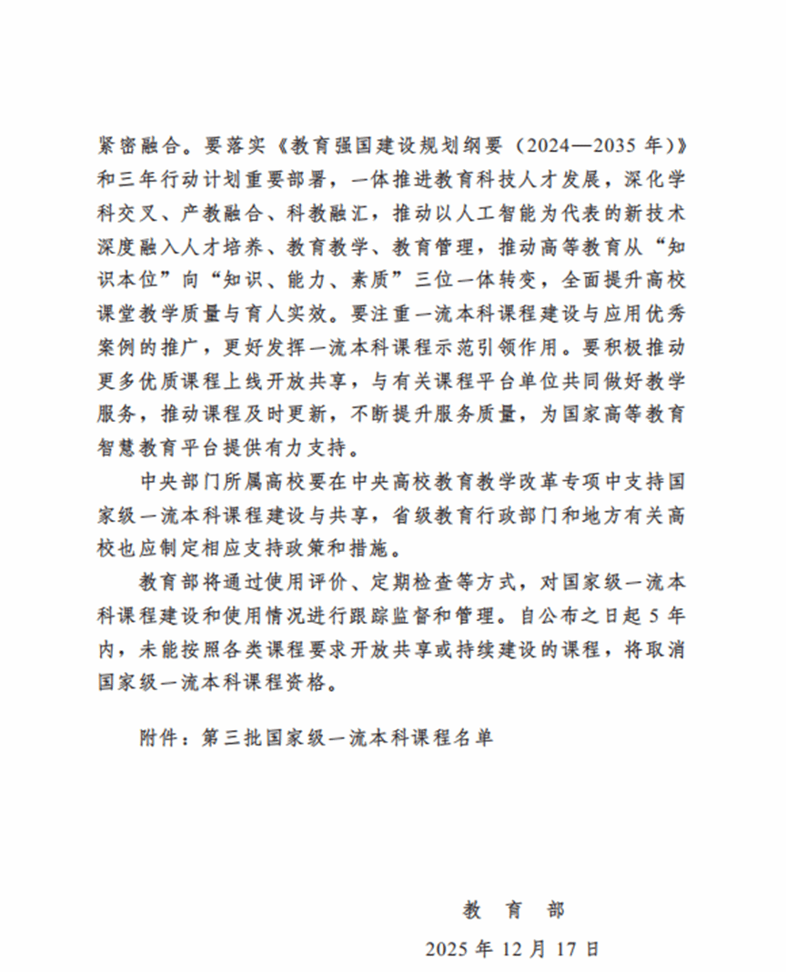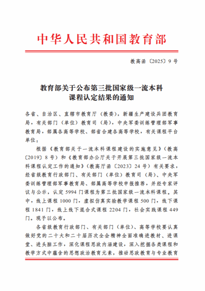 近日,教育部正式发布《关于公布第三批国家级一流本科课程认定结果的通知》(教高函〔2025〕9号),我院郑直老师负责的《开放平台实践课》(社会实践一流课程)和韩培林老师负责的《物理化学》(线上线下混合式一流课程)以鲜明的教学特色、丰富的课程内涵与显著的育人成效,成功入选第三批国家级一流本科课程。此次两门不同类型课程的同步获批,标志着我院本科课程建设实现了从单一突破到系统提升的跨越式发展,教育教学改革迈入高质量发展的全新阶段。
