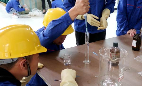 孙国富老师(左一)在化学化工学院实训中心给学生们上课