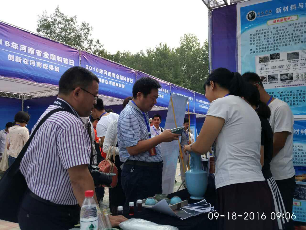 我校送展作品“走进纳米世界”围绕纳米材料与纳米技术领域的前沿知识,采用图文和实物结合的科普形式进行宣讲,主要介绍了我校在石墨烯储能方面、光催化环境治理方面、太阳能电池器件方面、贵金属复合纳米结构方面以及纳米钧瓷方面的相关研究成果。前来参观的公众对于我们展出的钧瓷展品以及贵金属复合催化剂的类酶催化实验颇感兴趣,赞叹我校在纳米材料领域取得的优异成绩。