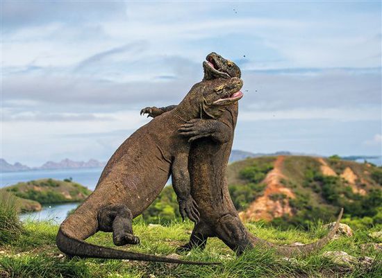 在印度尼西亚,地球上体型最大的蜥蜴——科摩多龙因为领土而发起残酷的打斗。这张展示此类较量的照片入围2015年度“野生动物摄影师大赛”。