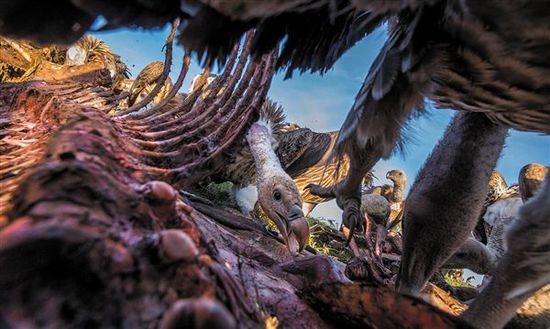 非洲秃鹰的日常生活因这张“胴体凸轮”图像而成为焦点。尽管场面有些阴森,但这些鸟类的进食习惯在保持生态系统健康方面发挥着关键作用。