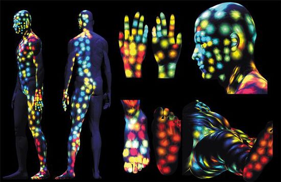 这张人体“迪斯科”地图将在最大器官——皮肤上发现的化学物质和微生物进行了分类。在志愿者以科学之名而3天没有洗澡后,来自两个健康人身上的400个拭子被取下。图片来源:Bouslimani