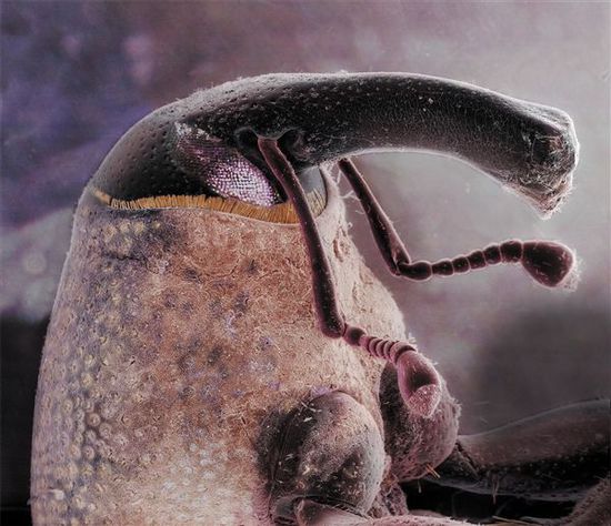 这张展现棉铃象甲头部的详细照片,是本年度惠康影像奖的赢家之一。通过扫描电子显微镜,仅有几毫米大的头部被拍摄下来。图片来源:Daniel Kariko