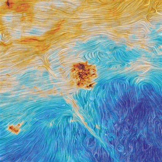 普朗克卫星提供了观看大麦哲伦星云(中间黑色圆点)和小麦哲伦星云(左下)的新鲜视角。这两个星系靠近人类所处的银河系。照片利用了用微波和亚毫米波长捕捉的数据。