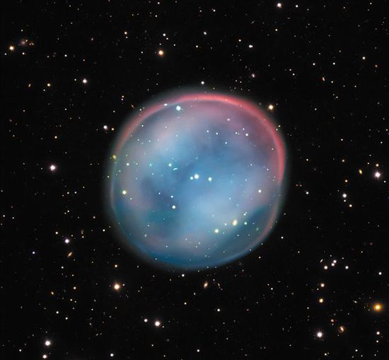 这张幽灵一样的图像是行星状星云—— 一种发出轻微光芒的死亡恒星残留物。它的绰号是“南猫头鹰”,由位于智利的甚大望远镜拍摄。图片来源:ESO