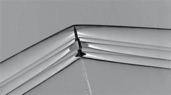 一架以超音速飞行的美国喷气式飞机产生的冲击波在莫哈韦沙漠上空被另一架飞机拍摄到。NASA研究人员利用一种德国物理学家August Toepler在19世纪首次开发的被称为纹影摄影的技术,在飞机穿过不同密度的空气时捕捉到了光的变化。图片来源:NASA Photo
