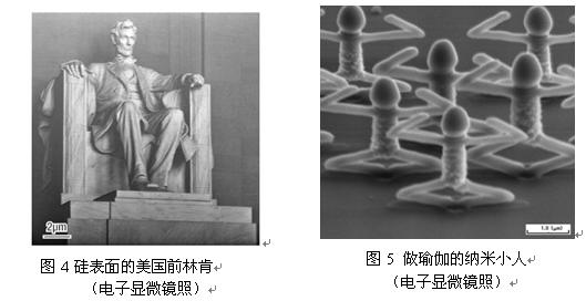 FIB刻蚀技术采用电磁场加速和聚焦带电的离子,进而可对硅等材质的表面进行刻蚀,如图4所示。FIB刻蚀原理与目前市场上流行的光刻技术相似,但由于离子的德布罗意(物质波)波长很短,因而刻蚀精度更高。离子束光刻主要包括聚焦离子束刻蚀和离子投影刻蚀等。其中,聚焦离子束刻蚀发展得较早,也较为完备,特别是镓离子聚焦技术。最近实验研究中已采用镓离子已获得了10纳米的分辨率。遗憾的是,FIB刻蚀技术效率低下,很难在实际生产中得到应用,但这并不妨碍科学艺术家用它来开展纳米雕刻艺术创作。如图5所示,该“做瑜伽的纳米小人”作品在2004年国际电子束/离子束/光束技术与纳米加工微观大赛中荣获了一等奖。作品中,每个小人身高2微米左右。作品的立体程度很高,每个小人姿态的相似性极高。可谓纳米雕塑中的极品。