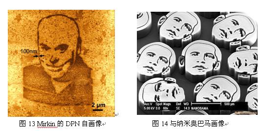 美国西北大学的Mirkin 研究小组近来开发了一种被称作“浸笔印刷术(DPN)”的技术。该技术用原子力显微镜(在STM基础上发展的一种设备)的针尖作“笔”,固态基底作“纸”, 能与基底产生化学反应的分子作“墨水”,分子通过凝结在针尖与基底间的水滴的毛细现象直接“书写”到基底表面。最近,Mirkin采用DNP给自己创作了一幅写真的自画像(见图13),该画像形象传神,线条清晰,整个画面的尺寸仅有约200´200微米,画像中的线条宽度为100纳米。