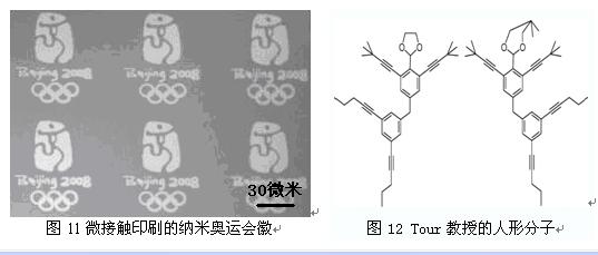 2008年,奥运会在北京隆重召开。此时,美国西北大学的纳米科学家Mirkin为奥运会送来了一份大礼(见图11),那就是一万五千枚奥运会会徽。不要觉得这没有什么了不起,要知道,这一万五千枚奥运会会徽个个尺寸都仅有几十微米左右,所有会徽被印在一块金的表面,只占了1平方厘米的空间,而印制这些会徽所采用的技术就是“微接触印刷”。
