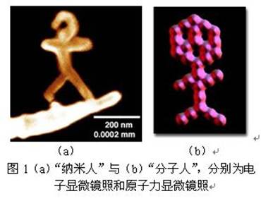 二十世纪末至本世纪初,纳米技术的发展对传统艺术带来了巨大冲击。其中,一个重要的特征就是艺术作品的小型化与微型化,即人们希望借助微纳米等高科技手段用极少的原材或代价生产更多、更优秀的艺术作品。这一特征在微纳米人物艺术创作方面尤为突出。以人物雕塑为例,陕西乾陵武则天无字碑前的参拜石像,高度和普通人相当;清朝张潮的《核舟记》中记载的桃核小船长不盈寸;英国当代微雕大师威拉德,借助显微镜,在大头针上仿照法国艺术大师罗丹的著名雕塑“思想者”,成功雕刻了人物身高约1毫米的微缩版;2007年,两位意大利纳米艺术家Scali和Goode则采用“光刻”技术制作了硅自由女神像雕塑,身高仅为0.5毫米;比上述自由女神像还小的“纳米”雕塑(见图1(a))来自美国伯明翰大学纳米研究实验室,是一个真正意义上的“纳米人”(1纳米=10-9米=10-6毫米=10-3微米),身高只有0.0004毫米,即400纳米左右,和病毒的尺寸相当;尽管如此,伯明翰大学的“纳米人”还不是最小的,目前世界上最小的雕像来自美国IBM公司的科学家。如图1(b)所示,是一个“分子人”,塑像共由28个一氧化碳分子组成。比较一下,陕西乾陵的参拜石像高度足足为“分子人”身高的三千万倍。
