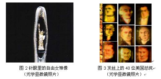 微纳米人物艺术是近些年来才出现的一种微型艺术形式。基于不同的视角,微纳米人物艺术有不同的分类。从表现形式来讲,微纳米人物作品可分为人物塑像、人物绘画、人物雕刻等。如图2所示,这是英国当代微雕大师Willard Wigan创作的微雕艺术品—“针眼里的自由女神像”,自由女神的身体、头部、手足等的粗细和头发丝相当;再如图3所示,这是当代华人微雕艺术家金银华的作品-“一根头发丝上彩绘的40位美国总统”;图4则显示的是德国Carl Zeiss NTS公司的科学家采用所谓的“聚焦离子束”刻蚀工艺,在硅表面雕刻的具有立体感的美国前总统林肯像。