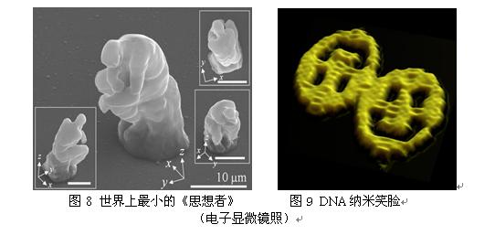 近年来,一种被称作“双光束聚合”的技术已经被发展到三维纳米构型的加工[10],并被用于材料表面塑像的构建。这里,最为典型的当数韩国研究人员的雕刻作品--“思想者”,见图8。该塑像高度仅为四个红血球大小,高只有五万分之一米。然而,这个即便只能用显微镜才能看清楚的思想者,其肌肉、甚至脚趾仍清晰可见。