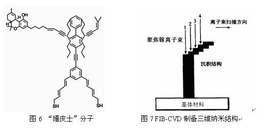 离子束化学气相沉积技术最早是日本学者松井真二提出的。该技术需要将一根头发置于芳烃的实验气氛环境中,并采用30keV的聚焦镓离子束在材料表面进行化学气相诱导沉积。目前,利用该项技术,科学家们已经制作了多个三维的纳米结构(雕塑)。如图7所示,FIB-CVD雕塑制作的思路如下:沉积时,先固定离子束,在发丝表面诱导形成一个基础立柱;然后离子束被移动一个不超过立柱直径的距离,静止不动直到在立柱顶端沉积出几十纳米厚度的阶梯;继续重复上述过程,就能使得沉积的材料层层叠加在前面沉积的结构上;最终在材料表面构造出复杂的三维纳米结构(塑像)来。图5“做瑜伽的纳米小人”就是FIB-CVD技术的代表作。