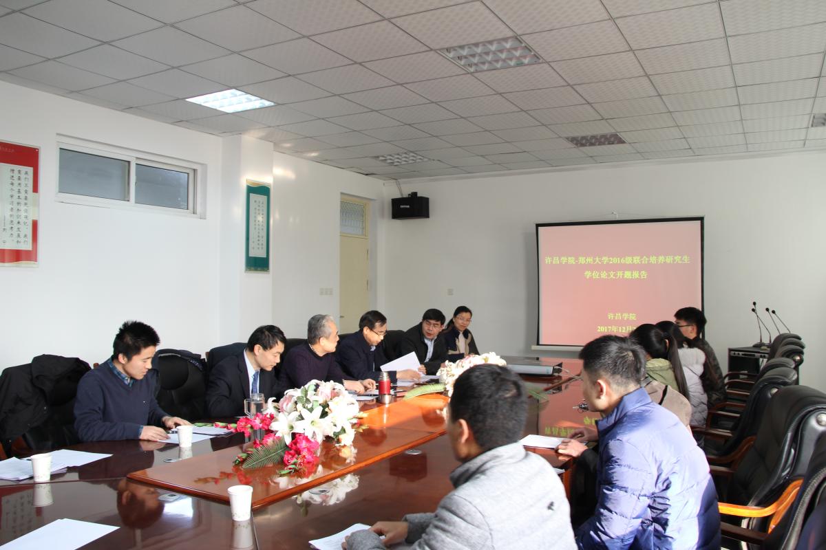 2017年12月27日,许昌学院与郑州大学材料科学与工程学院、化学与分子工程学院联合培养的2016级硕士研究生学位论文开题报告会在新材料与能源学院三楼会议室举行。郑州大学化学与分子工程学院院长李中军教授、郑州大学材料科学与工程学院曹少魁教授,我校副院长郑直教授、化学化工学院党总支书记许志红教授、学科办张艳鸽教授和新材料与能源学院何伟伟副教授等研究生导师参加了报告会。