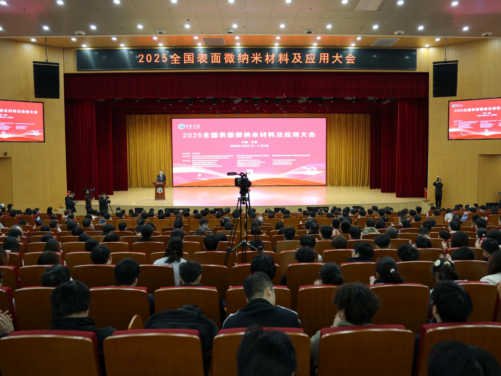 2025年11月1日,许昌学院主办、化工与材料学院(表面微纳米材料研究所)承办的2025全国表面微纳米材料及应用大会在智慧大楼多功能报告厅盛大开幕。中国科学院院士、中国科学院上海技术物理研究所褚君浩教授,中国科学院院士、上海交通大学金属基复合材料国家重点实验室主任张荻教授,加拿大工程院院士、临沂大学刘焕明教授,许昌市政府副市长李朝锋,许昌学院校长郑直教授,副校长杜根远、王俊、冯晓民,以及来自全国各地高校、科研院所、行业协会、企业的知名专家和学者、许昌学院师生代表六百余人参加会议。