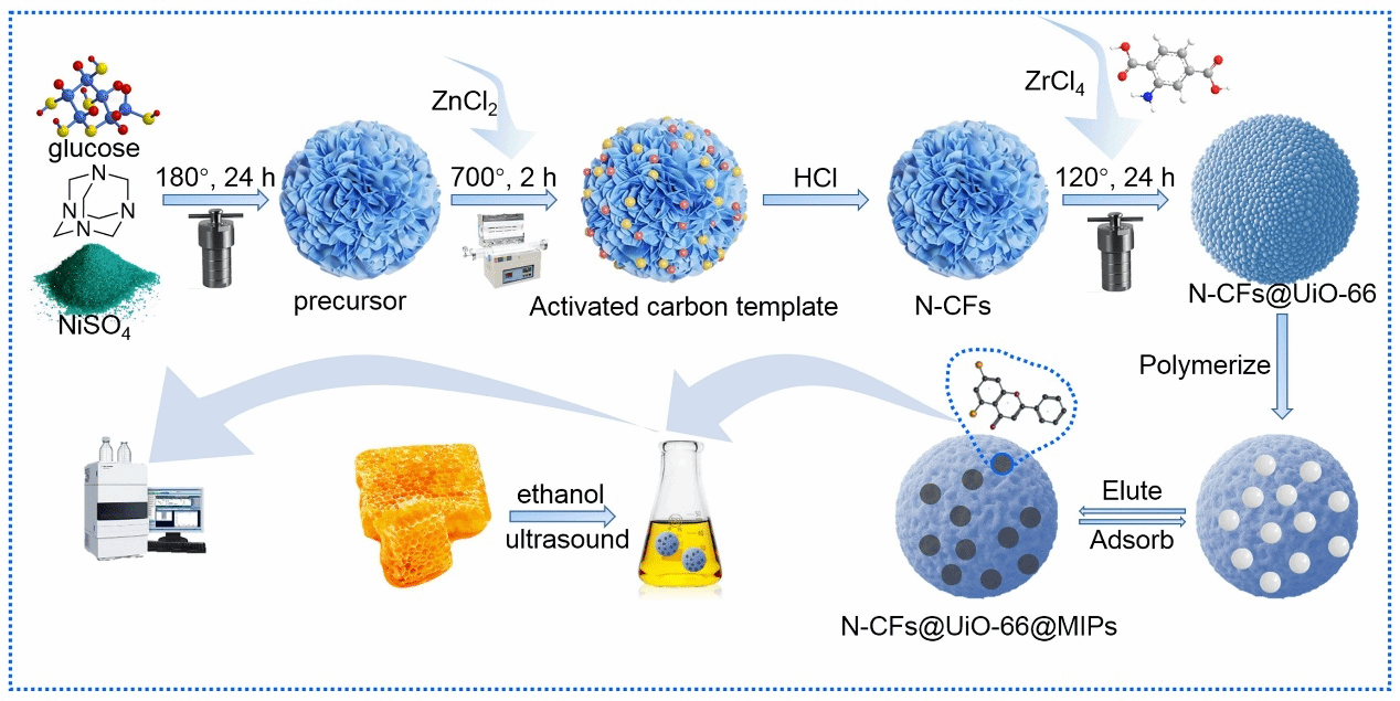 在针对蜂胶中白杨素的提取研究中,基于花瓣状碳球构建了UiO-66修饰的氮掺杂分子印迹聚合物材料N-CF@UiO-66@MIPs。以氮掺杂的多孔碳花为载体,在其表面原位生长金属有机框架(UiO-66),并包覆印迹层,形成具有高比表面积、大孔容和丰富识别位点的复合吸附剂。该印迹吸附剂材料展现出优异的吸附容量(117.6 mg g-1)和显著的选择性(IF=3.73),并拥有良好的抗干扰与循环使用性能。