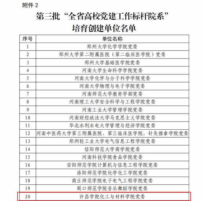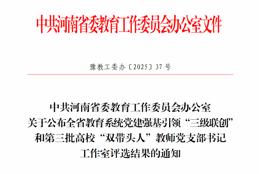 近日,中共河南省委教育工作委员会办公室印发《关于公布全省教育系统党建强基引领“三级联创”和第三批高校“双带头人”教师党支部书记工作室评选结果的通知》(豫教工委办〔2025〕37号),我院党委成功入选第三批“全省高校党建工作标杆院系”培育创建单位。