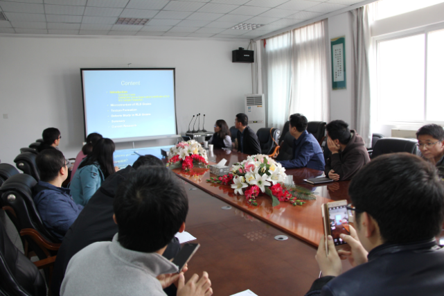 4月10日,应我院(所)邀请,美国宾州州立大学化学工程系访问学者钟蓉博士在我院三楼会议室做了题为《Microstructure of Two-Dimensional Grains in Copper Thin Films by Laser Induced Rapid Lateral Solidification (RLS)》的学术报告。院(所)部分教师参加了报告会,报告会由高远浩院长主持。