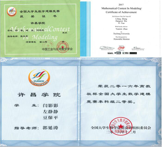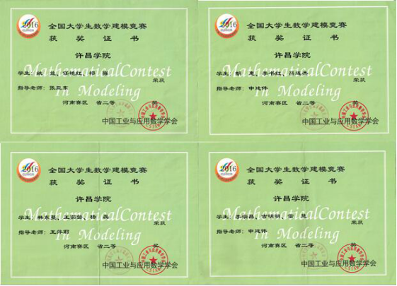 3、2016年11月 姚益、祁强、李宗昌、胡惠、林东蔓、王如磐等同学荣获全国大学生数学建模竞赛省级二等奖。