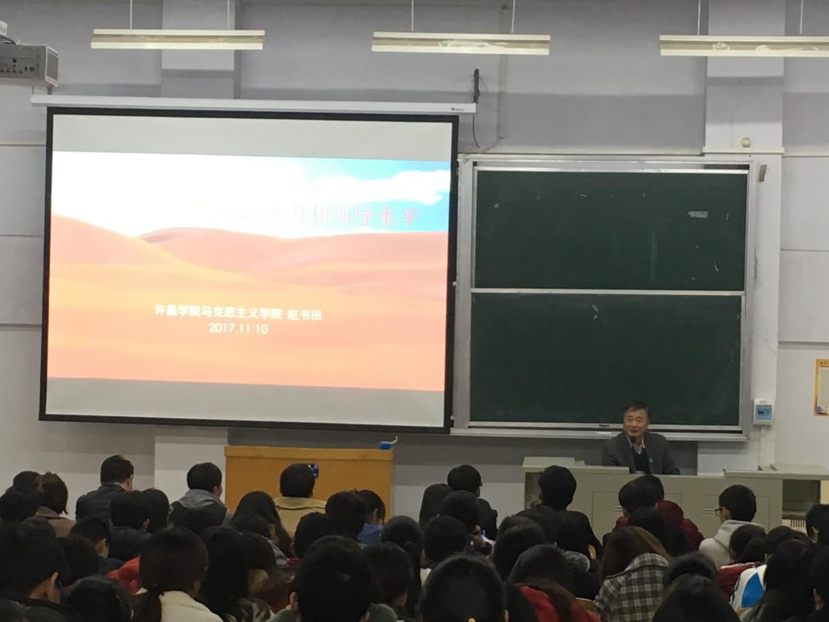 为了迅速在全院掀起认真学习宣传贯彻十九大精神的热潮,进一步加强青年大学生对党的认识,11月22日晚上,我院党总支特邀马克思主义学院赵书田老师在A合八教室为我院全体学生党员、入党积极分子宣讲党的十九大精神,这也是我院分党校第三期入党积极分子培训班的主要培训课程。报告会由党总支书记崔凤巧主持。