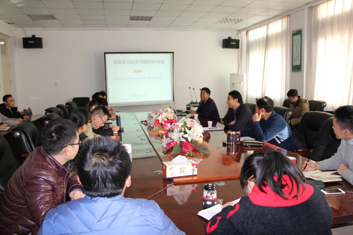 报告会上,武教授详细介绍了铜基薄膜光伏电池研究现状及应用,重点讲述了CIGS(铜铟镓硒)与CZTS(铜锌锡硫)化合物光伏材料的研究发展现状及课题组在CZTS光伏材料的独特合成与表征方面所做的工作,同时详细介绍了Ag梯度取代的(Cu1-xAgx)2ZnSn(S,Se)4光伏吸收层材料,得到了效率为11.2%的CAZTSSe薄膜太阳能电池。