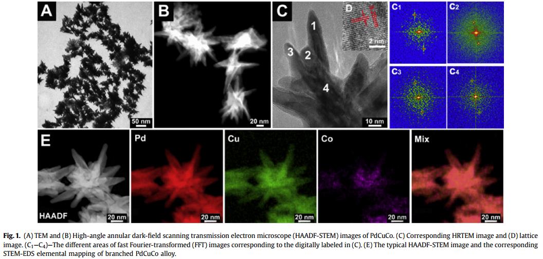 作为直接甲醇燃料电池(DMFC)中最常用的催化剂,贵金属铂(Pt)因为储量少成本高,严重限制了燃料电池的商业化应用。钯(Pd)金属被认为是一种潜在的催化剂,可以取代Pt作为高活性甲醇氧化(MOR)和氧还原反应(ORR)电催化剂。然而,相比于Pt,单金属Pd在催化过程中由于其电子传递能力较弱,稳定性较差,使得Pd在DMFC应用中同样面临着大的挑战。大量的研究表明,通过合金化引入其他过度态金属能够有效调节Pd的电子结构,改善其催化性能,同时有效降低催化剂成本。因此,制备Pd基合金纳米催化剂是一种获得高效DMFC催化剂的有效策略。
