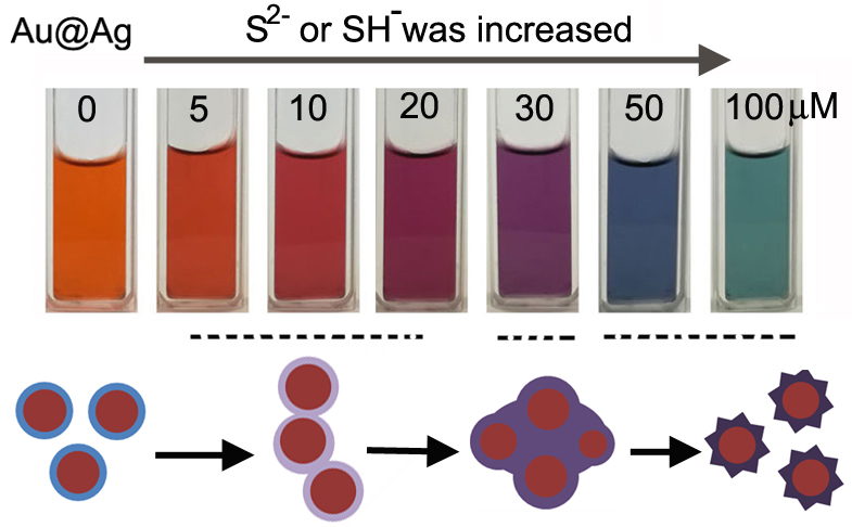 含硫物种与金属纳米颗粒的特定相互作用会显著影响纳米材料的性质和功能,该作用引起了研究兴趣但相关报道还不多。刘伟娟和李宗昌同学从大学二年级开始,跟随何伟伟老师开展本科生开放平台实践课程,选题着眼于研究无机硫离子与金属纳米颗粒的作用,他们以等离子体Au@Ag为模型,研究了多种硫物种(S,SH-,S2-)与Ag之间的硫化反应。他们发现硫化物和硫化氢可以引起Au@Ag到Au@Ag2S的快速转变,硫化程度不同伴随着可调控的表面等离子体共振和颜色产生。SPR变化程度反映了S和Au@Ag之间的反应动力学行为。SPR最大波长或吸光度与硫化物的浓度之间具有线性关系,进而可实现对硫离子的快速可视化检测。该方法对硫粉和硫化物(S,SH-,S2-)的检测具有高灵敏度和选择性。由于硫物种和Ag NP广泛用于生物和环境系统,这些结果可为在金属纳米颗粒和含硫分子的组合中寻找新应用。