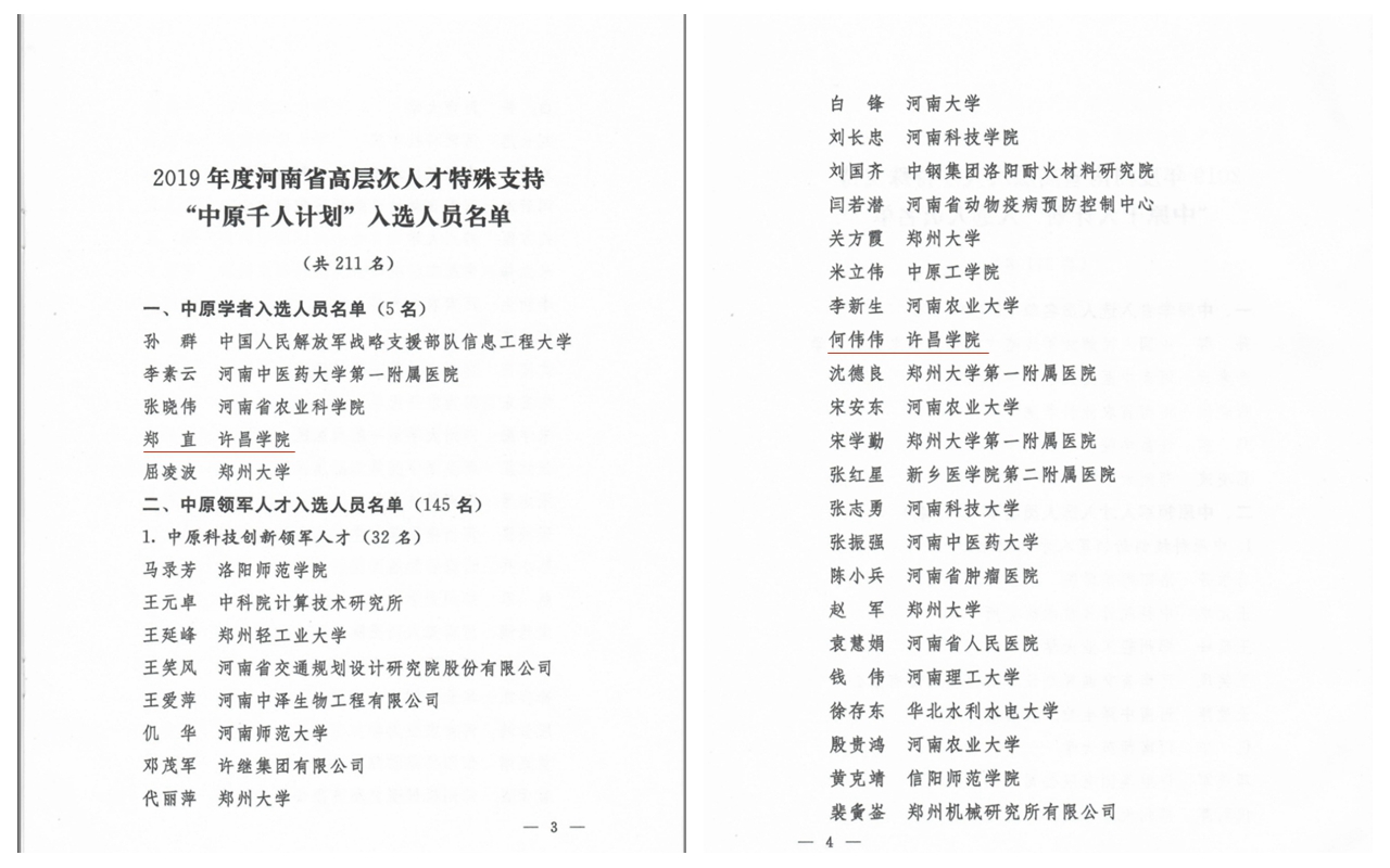日前,中共河南省委组织部和河南省人力资源和社会保障厅联合发文(豫组通[2019]45号),公布了2019年度河南省高层次人才特殊支持计划入选人员名单。我校副院长郑直教授入选“中原学者”,新材料与能源学院何伟伟教授入选“中原科技创新领军人才”,学校高层次人才建设获历史性突破。