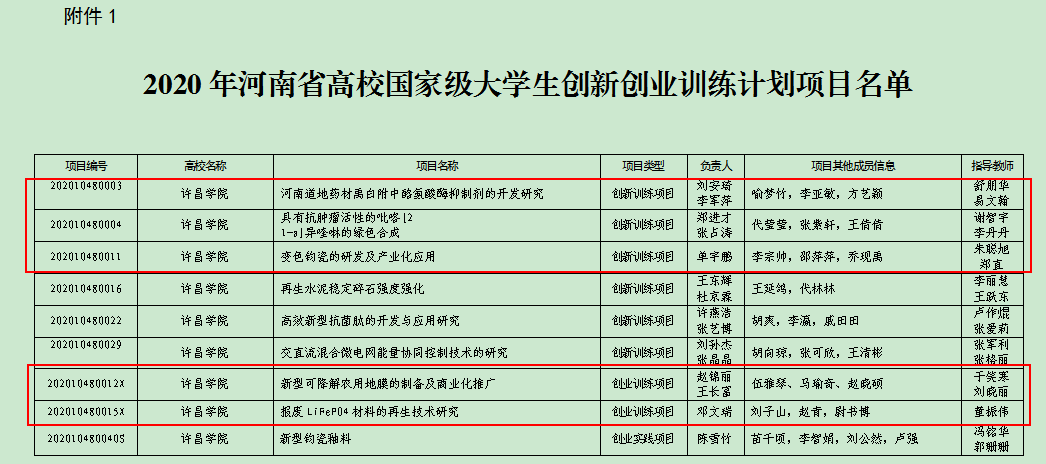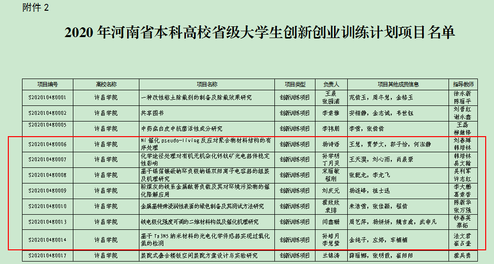 日前,河南省教育厅公布了2020年国家级和省级大学生创新创业训练计划项目名单,我院申报的《河南道地药材禹白附中酪氨酸酶抑制剂的开发研究》、《变色钧瓷的研发及产业化应用》等5个项目获批2020年国家级大学生创新创业训练计划立项。我院申报的《Ni催化pseudo-living反应对聚合物材料结构的有序处理》、《化学途径处理对有机无机杂化钙钛矿光电器件稳定性影响》等7个项目获批2020年省级大学生创新创业训练项目立项。