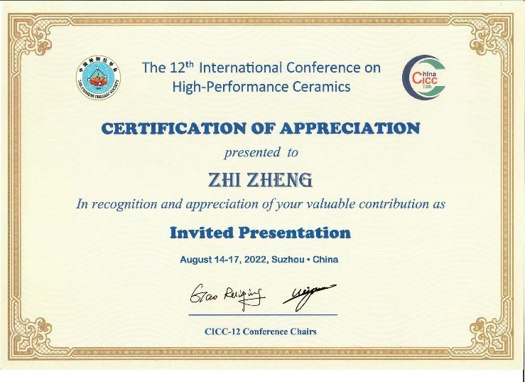 2022年8月14-16日,由中国硅酸盐学会发起的第十二届先进陶瓷国际会议(12th International Conference on High-Performance Ceramics (CICC-12) ) 在中国苏州举行,我院郑直教授受邀做了题为“Environment-friendly Cu-based Perovskite Thin Film Solar Cell Materials and Devices”的报告。