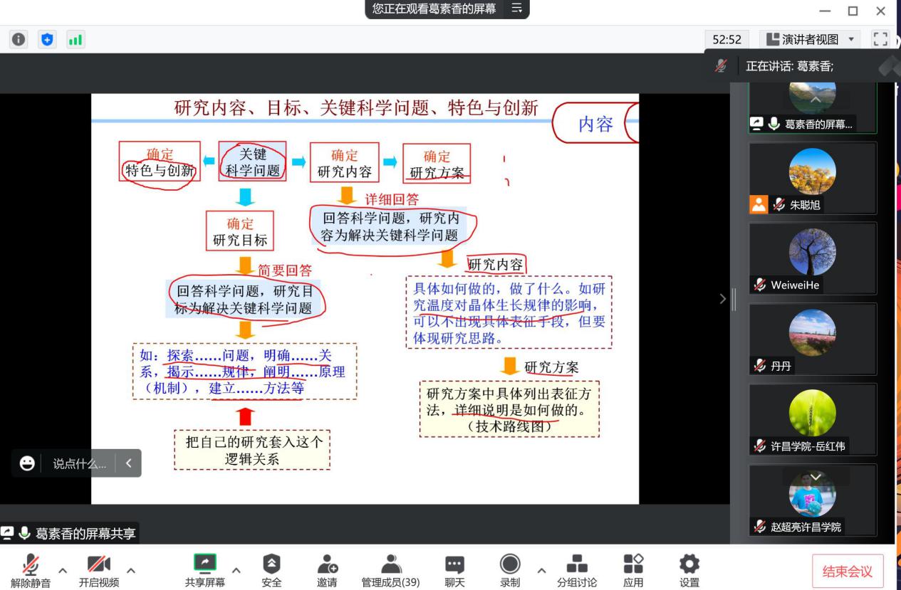 会上,葛素香老师结合自身国家自然科学基金申报经历,围绕关键科学问题从题目、特色与创新、研究内容、研究目标、研究方案等方面详细讲解了国家自然科学基金申请书撰写注意事项和规范,并分享了申报获批国家自科青年基金和面上基金的心得体会。葛老师的报告内容充实、引人入胜,此次基金推进交流会让我院青年教师对国家基金撰写有了更全面的认识,鼓励我院教师下一步更好地做好科研。