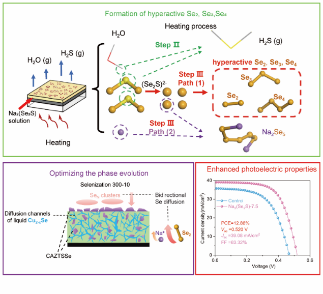 为此,郑直课题组与河南大学武四新教授、国家纳米中心丁黎明研究员合作,基于N,N-二甲基甲酰胺(DMF)溶剂体系,提出了一种利用小分子、高活性硒源的预硒化技术。该技术通过对硒硫化钠(Na2(Se2S))溶液进行旋涂退火,获得了高活性硒源Se2, Se3, 和Se4,在硒化时与SeN一起形成双向硒扩散。优先形成的Cu2-xSe液相在体相中形成了扩散通道,不仅促进了薄膜化学组成的均一化,还明显抑制了二次相ZnSe以及CuZn, SnZn反位缺陷和 [2CuZn + SnZn] 缺陷簇。钠离子(Na+)促使薄膜延(112)面择优生长,提高了结晶质量。本工作获得了12.86%的能量转换效率(PCE)和0.520 V的开路电压(Voc),这是目前常压硒化条件下制备的DMF基CZTSSe太阳能电池的最佳性能。