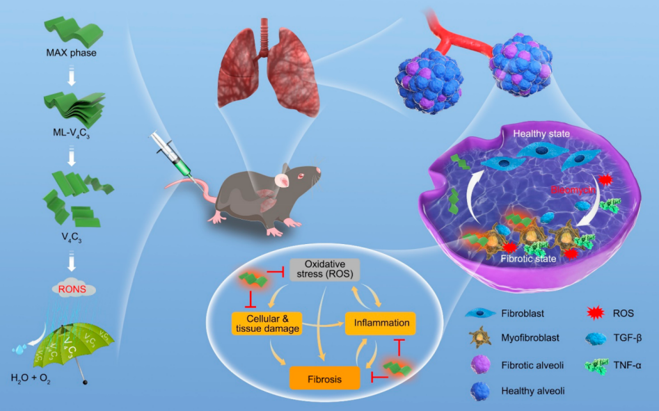 近日,我院纳米催化材料与应用团队在高效抗氧化纳米酶设计及肺纤维化治疗研究领域取得重要进展,相关研究结果以“Vanadium Carbide Nanosheets with Broad-Spectrum Antioxidant Activity for Pulmonary Fibrosis Therapy”为题发表在美国化学会纳米科学TOP期刊《ACS Nano》(ACS Nano, 2023, DOI: 10.1021/acsnano.3c06105),影响因子为17.1。