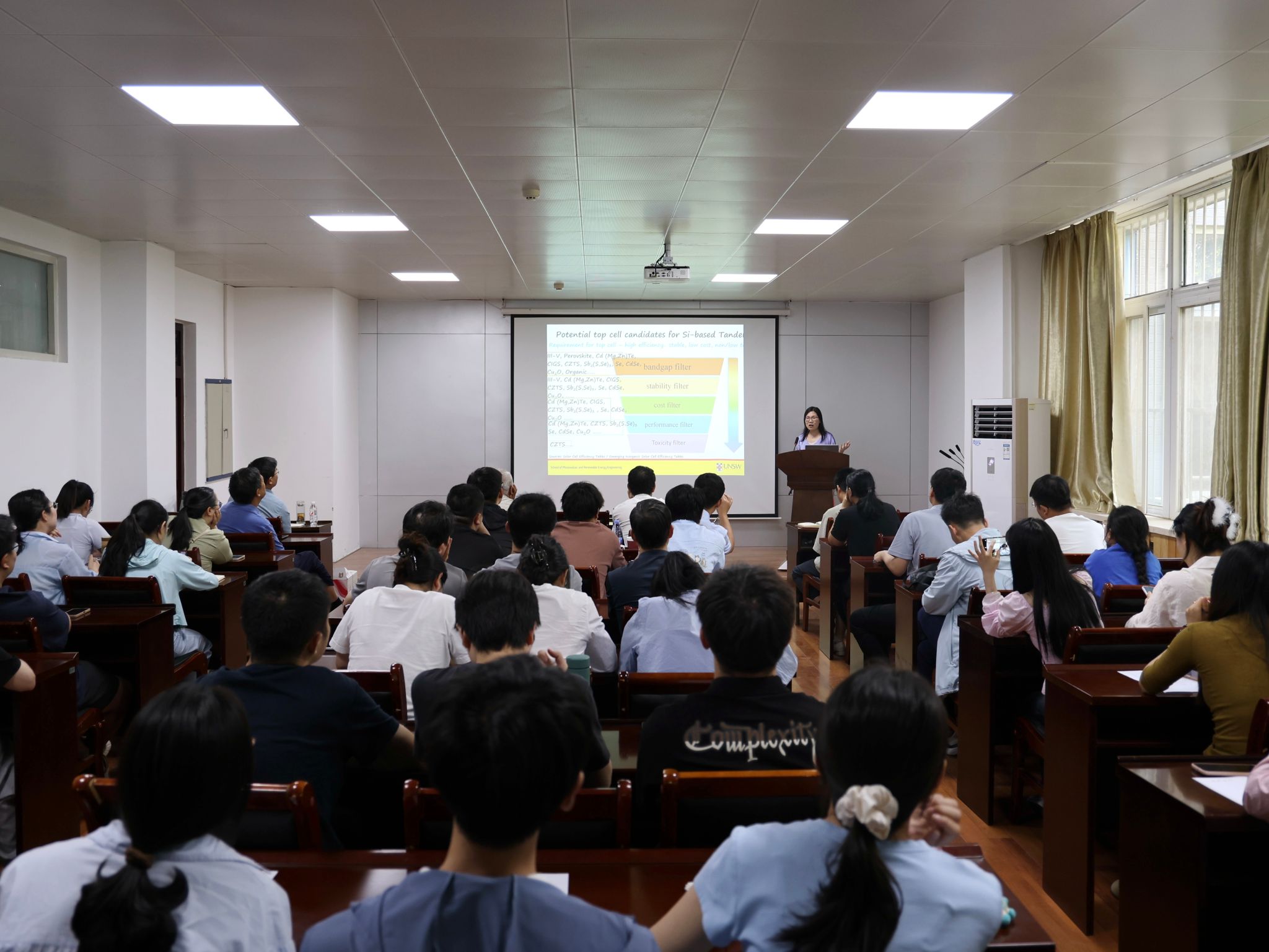 报告现场学术氛围热烈,与会研究生和太阳能电池方向相关教师与专家进行了深入友好的交流。我校郑直教授团队的刘满营老师做了题为《新型铜银铋碘薄膜太阳能电池材料与器件》的研究汇报,并就目前研究中存在的薄膜质量、器件性能优化等核心问题与专家进行了深入讨论。专家结合目前的研究情况对问题进行逐一解答,为与会师生拓展科研思路提供了宝贵参考。(摄影:杨哲)
