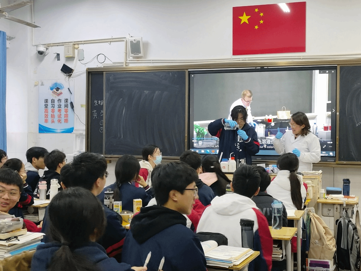 “碘钟反应”是化学动力学中的一个经典演示实验,它通过一系列连锁反应,能够像时钟一样,精准地控制溶液颜色发生突变的时刻。活动中,何琴老师首先以生动有趣的讲解,揭开了这个“化学时钟”的神秘面纱:反应涉及过氧化氢、碘酸钾、硫酸锰等多种物质,在淀粉指示剂的存在下,通过精确控制反应物浓度和温度,可以“设定”颜色变化的“闹铃”时间。实验结束后,何老师引导同学们将这一原理与实际生活、现代科技相联系。同学们踊跃提问,就反应机理、应用前景乃至更广阔的化学世界与老师进行了热烈讨论。
