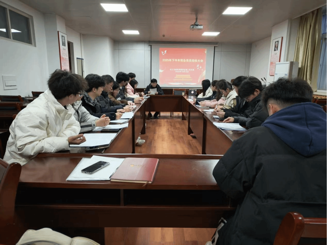 2025年12月13日,我院学生第二党支部在化材楼S302及线上腾讯会议同步召开2025年下半年预备党员接收大会,本次会议由牛景锐老师主持,特聘学生党建组织员崔凤巧同志、党支部书记王濛濛老师,全体学生党员、本期发展对象参加本次会议。