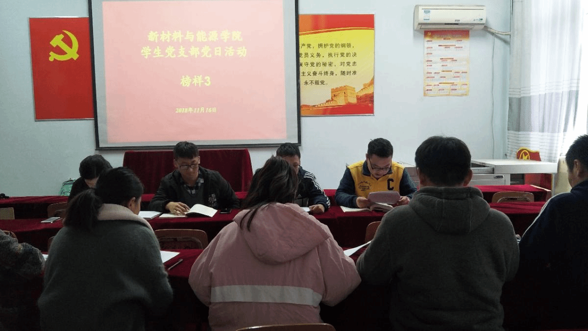 2018年11月16日星期五上午9:50,学生党支部在新材料与能源学院党团活动室开展学习讨论《榜样3》的主题党日活动。