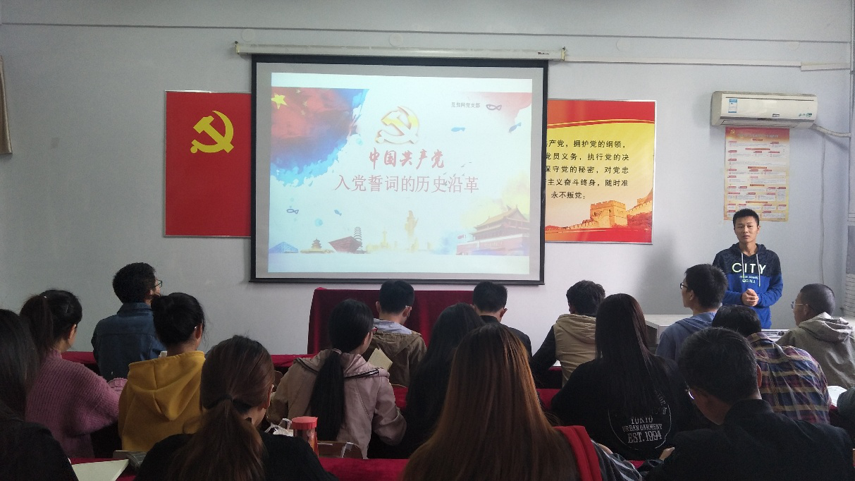 2018年11月4日上午9:00,我院第五期分党校入党积极分子培训班第六讲在四楼党团活动室进行。本次课程的主讲人为新材料与能源学院学生党支部学生党员雷鹏阳同志。雷鹏阳同志本节课要讲的主题是中国共产党入党誓词的历史沿革。