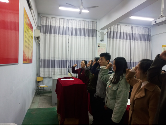 大会随着国歌的唱响拉开了序幕。首先,由周婷婷老师郑重的宣读了新接收预备党员名单。然后,五位新党员在崔凤巧书记的带领下,面向党旗庄严宣誓,立誓为共产主义奋斗终身。宣誓后,新发展党员代表陈璐同学、老学生党员代表吴亚娟同学随后也发表了自己的感想。党员,不仅仅是一个称号,更象征着一种神圣的责任感、荣誉感和使命感。每位学生党员都应以党员的先进性标准要求自己,发挥党员的模范带头作用,争做一名优秀的共产党员。