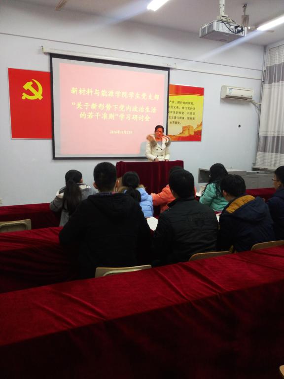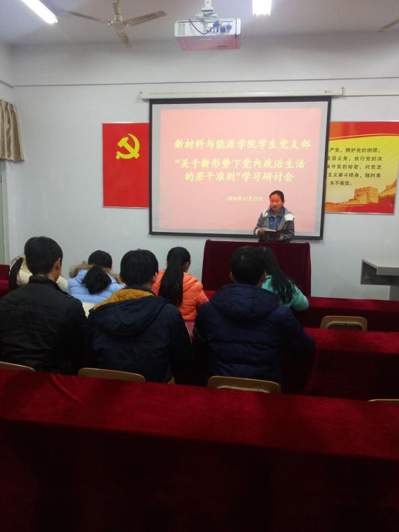为了更好的学习十八届六中全会制定的《关于新形势下党内政治生活的若干准则》(以下简称《准则》)的内容,11月25日下午6:30,我院学生党支部开展了《准则》学习研讨会。
