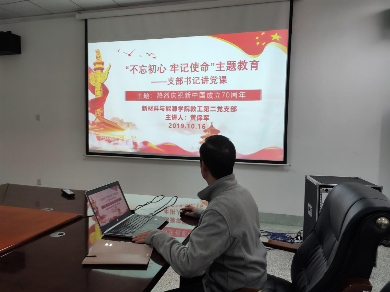 10月16日上午10:40,我院教工第二党支部在A4三楼会议室举行了“不忘初心、牢记使命”主题教育“支部书记讲党课”活动,黄保军书记做了一场主题为《热烈庆祝新中国成立70周年》的专题党课。