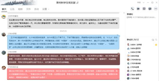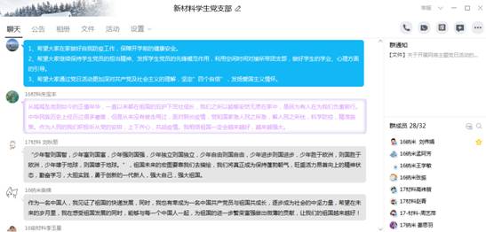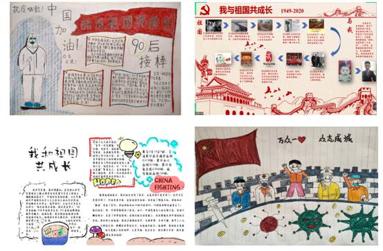 会前,每位党员都绘制了一份“我与祖国共成长”为主题的手抄报。为了让大家都有展示自己的机会,学生党员分成5个小组先期开展了组内讨论,并推选出“最优手抄报”,由推荐出来的党员分享最优的手抄报内容和个人感悟,随后将本组的开展情况和组员寄语向大家进行转述。会上,大家通过手绘、电脑制图等各种不同的形式展现出一幅幅众志成城、全民抗疫、紧要关头、团结一心的热血画面,通过一个个场景来讴歌奔赴一线的志愿者,赞美多日坚守岗位的奉献者。于笑寒肯定了大家的成果展示,同时提出了三点建议:1、希望大家在家做好自我防疫工作,保障开学前的健康安全。2、希望大家继续保持学生党员的担当精神、发挥学生党员的先锋模范作用,利用空闲时间对接所带团支部,做好学生的学业、心理方面的引导。3、希望大家通过党日活动更加坚定“四个自信”,弘扬爱国主义情怀。