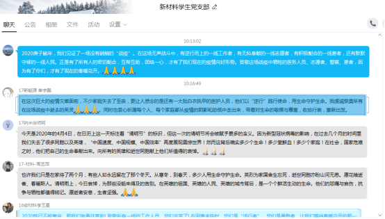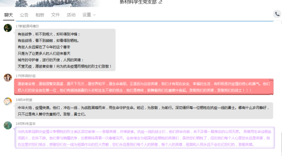 新材料与能源学院学生党支部书记于笑寒说:2020庚子鼠年,我们见证了一场没有硝烟的“战疫”。在这场无声战斗中,有逆行而上的一线工作者,有无私奉献的一线志愿者,有积极配合的一线患者,还有默默守候的一线人民。正是有了所有人的密切配合,互帮互助,团结一心,才有了我们现在的疫情向好形势。致敬这场战疫中牺牲的医务人员、志愿者、警察、患者,因为有了你们,才有了现在的春暖花开。