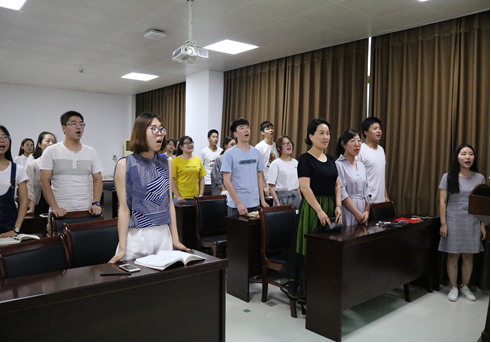 本次活动还特别邀请到音乐学院的王菲同学教大家唱《国际歌》,虽然对非专业人士来说很难,但在王菲同学的带领下,老师和同学们学得都很认真。
