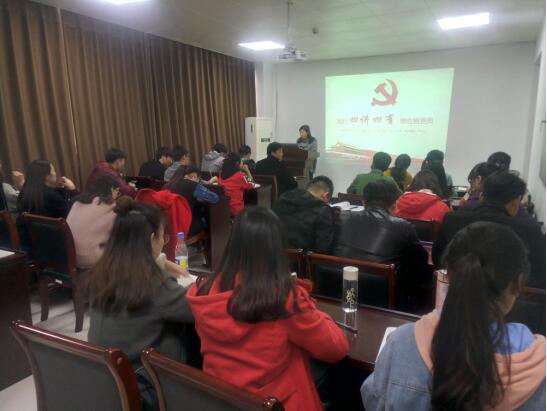 11月12日下午,胡泊老师以“践行四讲四有,做合格党员”为主题,教育同学们做“四讲四有”新青年。其中,老师强调“讲政治、有信念是爱党之源,讲规矩、有纪律是护党之要,讲规矩、有品行是兴党之本,讲奉献、有作为是为党之基。”