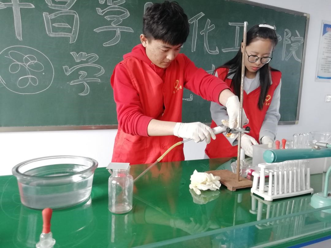 到达目的地后,带队老师简单交代了注意事项,实践活动正式开始。首先由学生党员徐润潮讲述专题党课——“文化自信”,教导学生对文化特别中国传统文化有进一步的理解,生动形象的语言令同学们产生思想共鸣。接下来是龚召香、娄淑云两名学员对于自己大学学习生活的心路历程展开叙述,并和同学们交流学习经验,现场气氛热烈,伴着热烈的掌声上午活动到此结束。下午,针对 “淀粉和碘单质的变色反应”、“酚酞和氢氧化钠的显色反应”、“高锰酸钾加热制备氧气”三个实验进行具体演示。学生们在变化莫测的化学反应中,露出赞叹的表情,学员们对于提出的问题耐心的进行解答。活动逐渐落下帷幕。