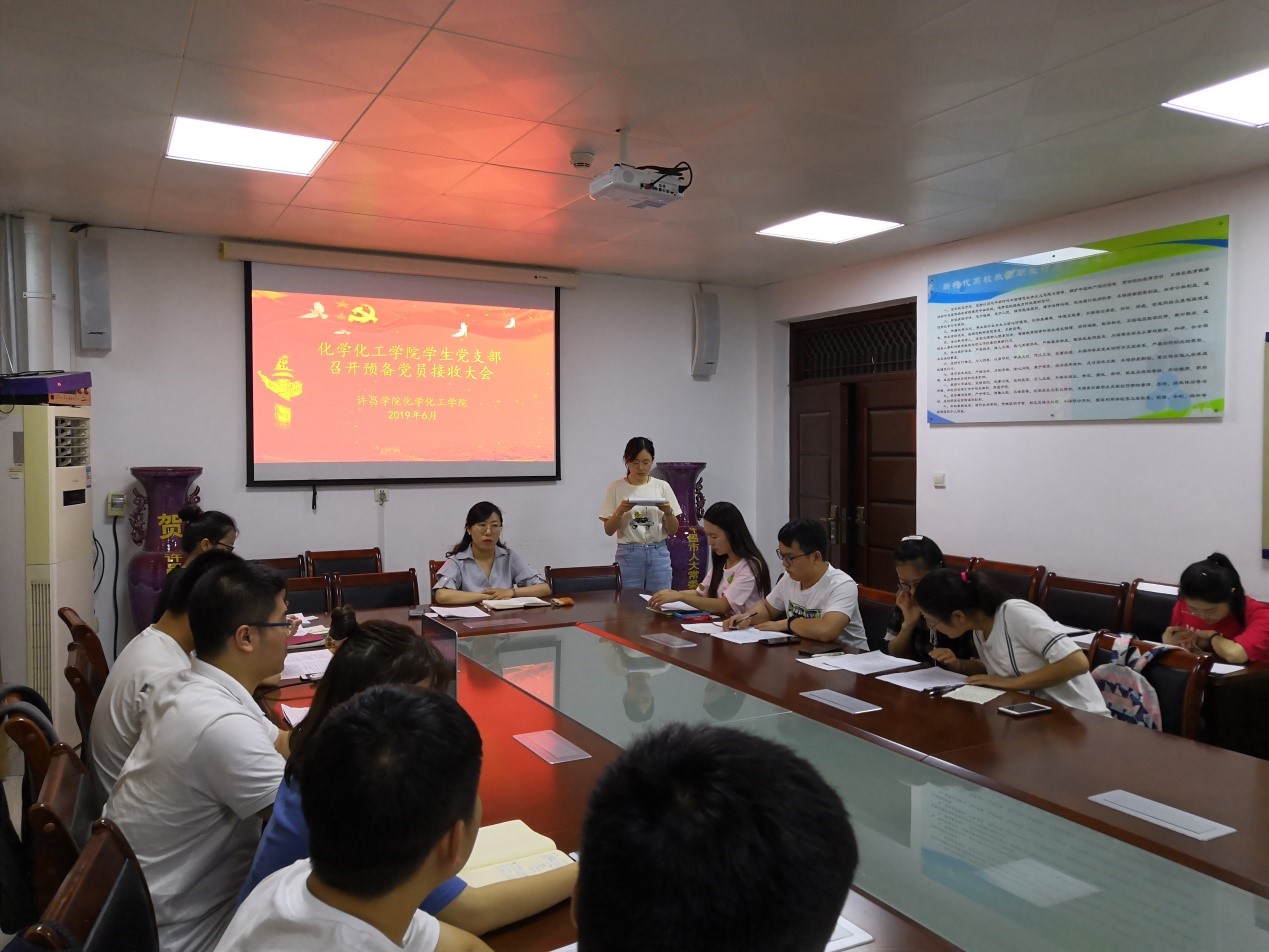 2019年6月18日,我院学生党支部在化工楼w306召开预备党员接收大会。参加本次会议的有化学化工学院学生党支部书记胡泊老师、全体学生党员及新一批发展对象。本次会议由学生党支部组宣委员柴珂珂主持。