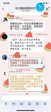 会上,各学生党员纷纷发表了自己的感受。学生党员吴宁宁说道:“曾经是你,今天是我,那些前赴后继的医护人员他们都是最美的“逆行者”,这展现的是一代又一代青年人的接力;学生党员黄彩琳说道:“疫情面前方显国家本色。在大灾大难面前,从疫情中心的武汉到湖北全省再到全国各地,全国人民生活安定有序,经济社会发展大局保持稳定,这本身就是一个了不起的成绩,就是中国力量的展现。最后胡泊老师提出,希望学生党员牢记使命,坚守岗位,带动广大青年不惧风雨、勇挑重担,为打赢疫情攻坚战出一份绵薄之力,让青春在党和人民最需要的地方绽放绚丽之花。