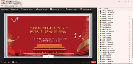 2020年3月15日19:00,我院学生党支部开展“我与祖国共成长”网络主题党日活动,学生党支部书记胡泊老师及全体学生党员参会.