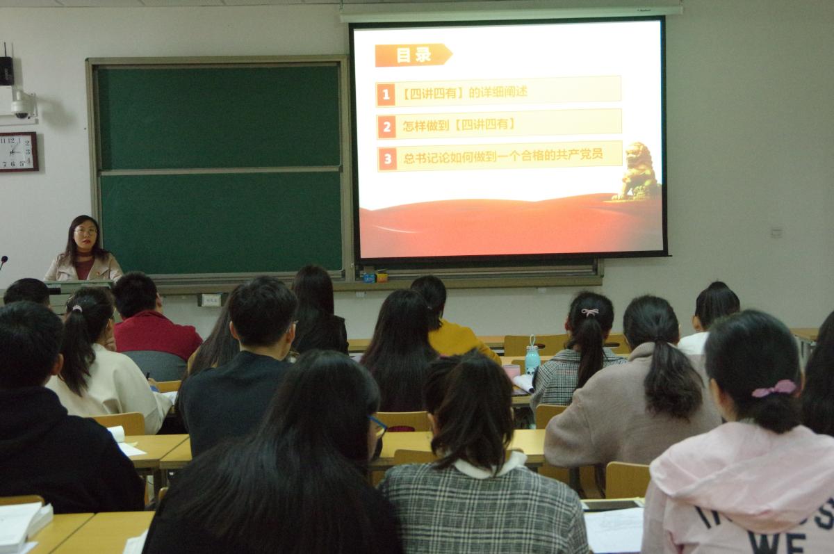 此次授课的主题为“践行四讲四有,做合格党员”,意在让我院入党积极分子明白“四讲四有”的本质,不仅是一名合格党员的核心要素,也是对新时代党员党性的客观要求。课程开始,胡泊老师详细讲解了“四讲四有”的主要内容,明确爱党之源就是讲政治,有信念;护党之要就是讲规矩,有纪律;兴党之本就是讲道德,有品行;为党之基就是讲奉献,有作为。之后,胡泊老师强调了“四个意识”、“四个自信”。增强政治意识、大局意识、核心意识和看齐意识,切实做到对党忠诚、为党分忧、为党担责、为党尽责;更要增强道路自信、理论自信、制度自信和文化自信,始终坚持和发展中国特色社会主义。